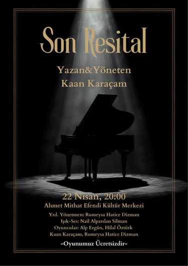 "Son Resital", alışılagelmiş, mesafeli ve ciddi piyano konserlerinin duvarlarını yıkan; müziği, tiyatroyu ve hayatın absürt yanlarını aynı sahnede buluşturan disiplinlerarası bir performans yolculuğudur. Kaan Karaçam’ın tuşlara döktüğü her nota, sadece bir melodi değil; bazen derin bir melankoli, bazen de bir piyanistin başına gelebilecek en trajikomik aksiliklerdir.
